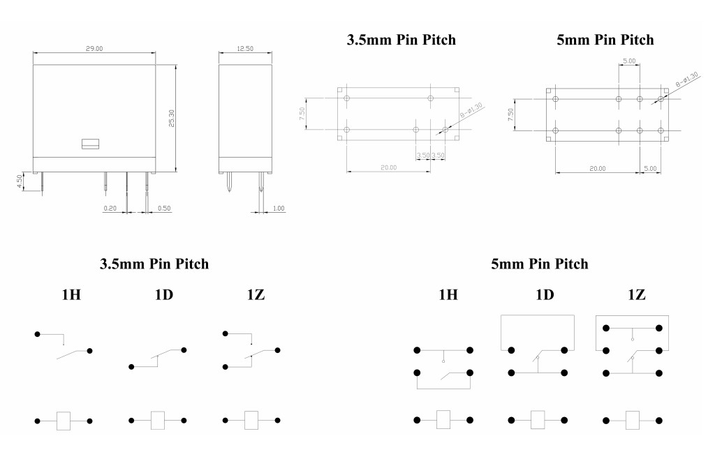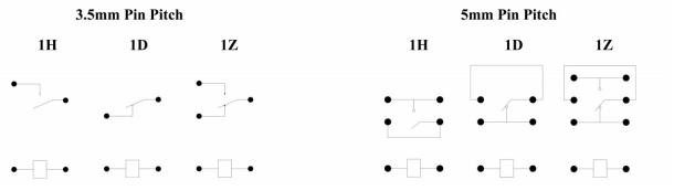 Контактная функция | Форма | 1Z (SPDT), 1H (SPST-NO), 1D (SPST-NC) | 2Z (DPDT), 2H (DPST-NO), 2D (DPST-NC) | ||||